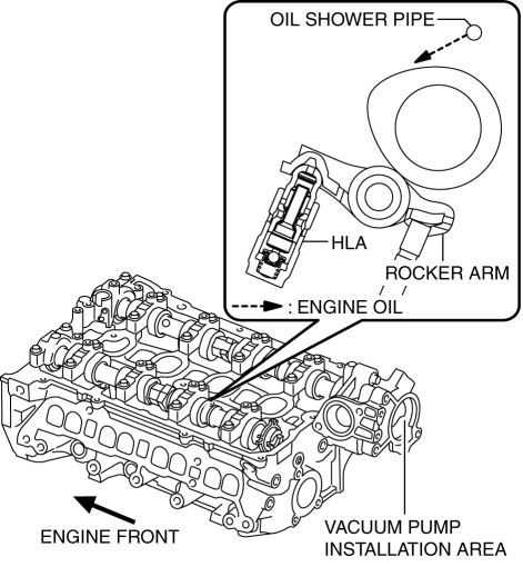 The contact point of the rocker arm and cam is lubricated by the engine oil injected from the oil shower pipe.
