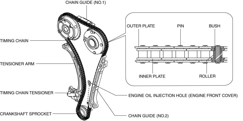 Lubrication of the timing chain and each sprocket is performed using the engine oil from the engine front cover.