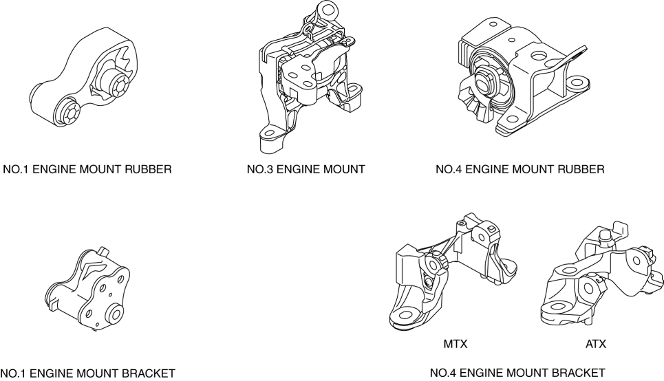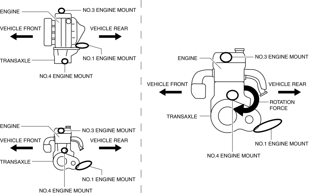 The three points at the front of the engine (No.3 engine mount), one side of the transaxle (No.1 engine mount), and the rear upper part of the transaxle (No.4 engine mount) are supported.
