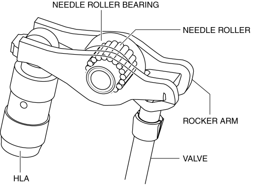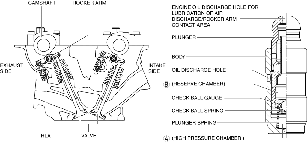 The HLA maintains the valve clearance at a constant 0 mm {0 in} and maintenance-free valve clearance is realized.