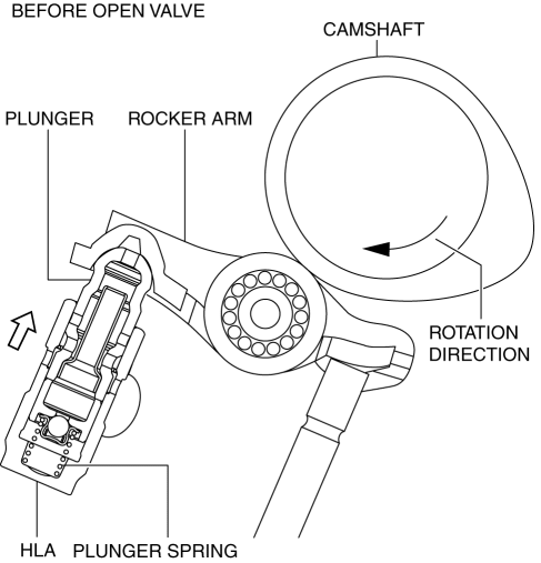 1. The plunger presses up the rocker arm by the spring force of the plunger spring to maintain the valve clearance at 0 mm {0 in}.