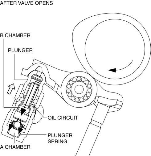 3. If the hydraulic passage is closed, the plunger is fixed becoming the rocker arm pivot point because the volume of the engine oil in the high pressure chamber is not changed.