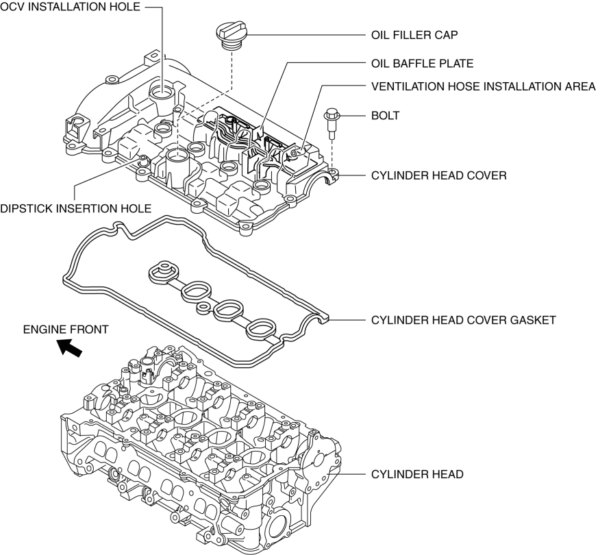 The cylinder head cover prevents foreign matter penetration and engine oil spatter. The oil baffle plate reduces engine oil consumption by separating the engine oil from the blow-by gas.