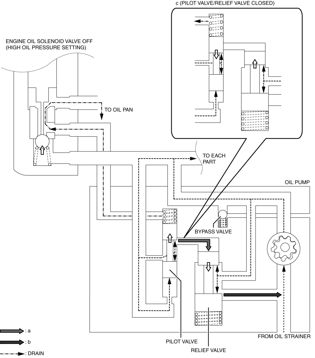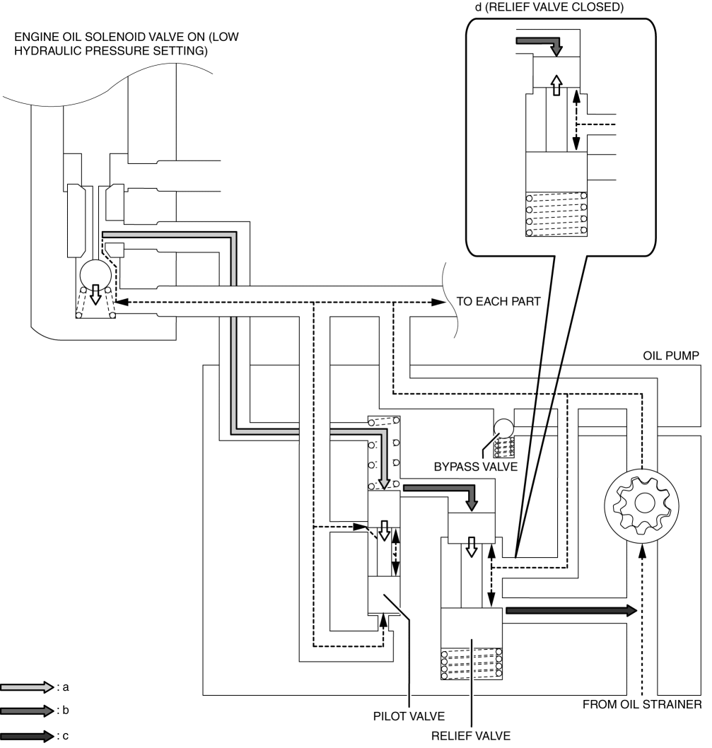 When oil pressure is less than the pilot valve opening pressure, the pilot valve closes. As a result, the relief valve closes and engine oil flow stops (oil pressure increase).