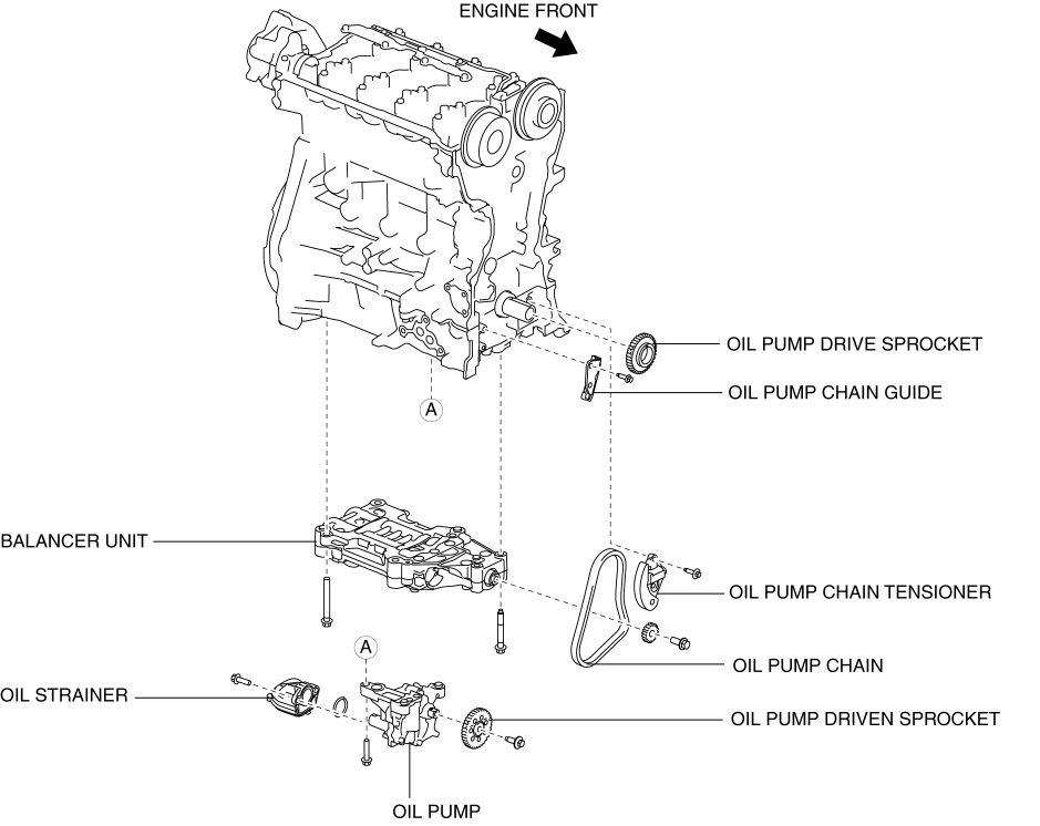 The oil pump suctions the engine oil in the oil pan through the oil strainer and pumps engine oil into the engine.