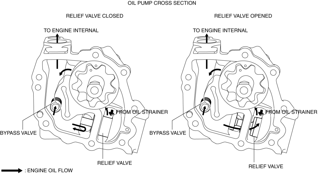 The relief valve and bypass valve is pushed and opened if oil pressure increases excessively when starting an extremely cold engine. As a result, the engine oil flows and excessive oil pressure increase is suppressed.