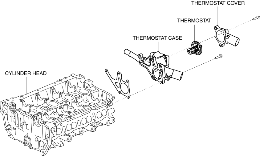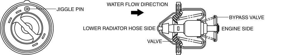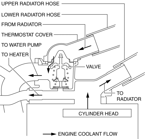 1. When the engine coolant temperature decreases, the thermostat valve closes and engine coolant circulates without passing through the radiator.