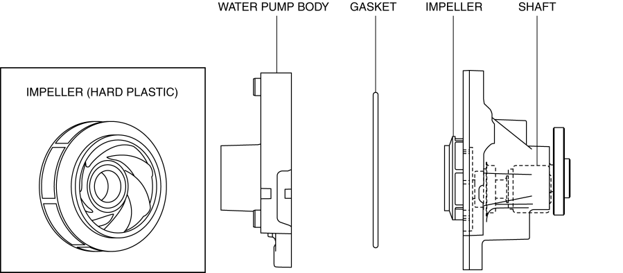 2. The impeller with the water pump pulley and shaft connected rotates to pump engine coolant.