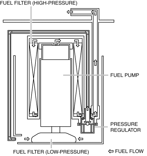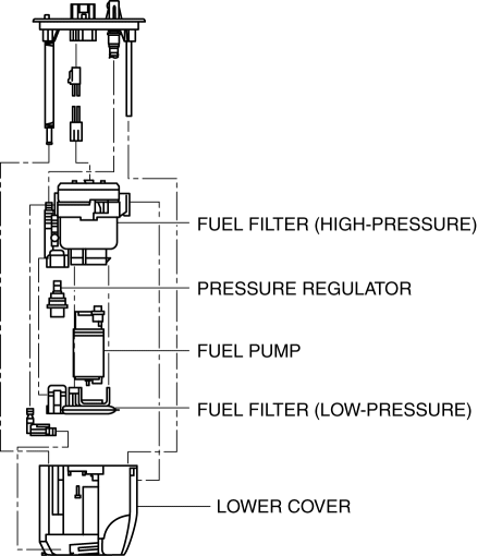 Based on the control signal from the PCM, the fuel pump suctions fuel in the lower cover and pumps it to the high pressure fuel pump. After fuel is sufficiently filtered through the fuel filter (low-pressure) and fuel filter (high-pressure), fuel pressure is adjusted to approx. 430 kPa {4.38 kgf/cm2, 62.4 psi} by the pressure regulator.