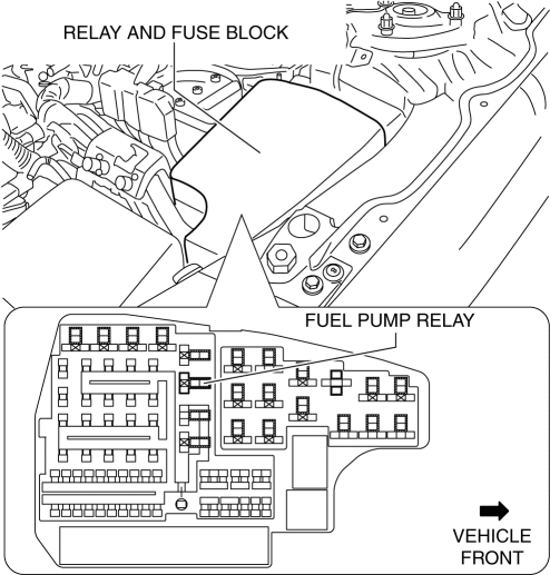 The fuel pump relay is installed in the relay and fuse block.