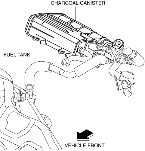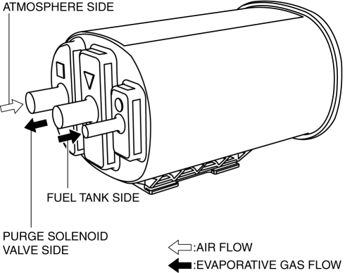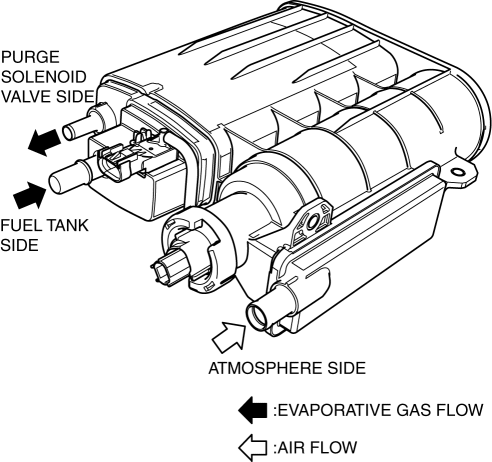 When the purge solenoid valve is open, evaporative gas, which is absorbed by the activated charcoal, is released by the intake manifold vacuum and the gas flows to the intake manifold.