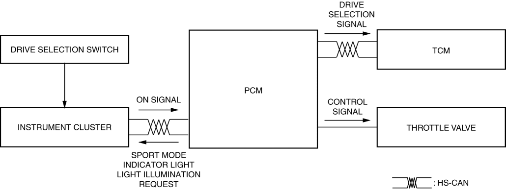 The PCM sends a sport light illumination request signal to the instrument cluster. The instrument cluster turns on the sport light to notify the driver that the drive selection control condition has been switched to sport mode.