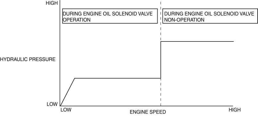 The engine hydraulic pressure switches in two steps. When hydraulic pressure is not needed, the oil pump discharge amount is reduced by the operation of the engine oil solenoid valve.