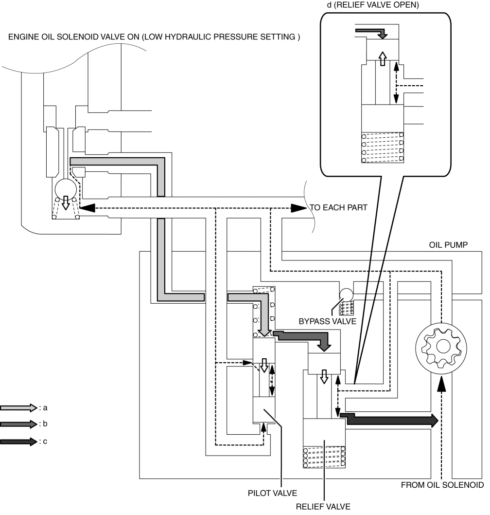 Engine oil flow during low hydraulic pressure setting (engine oil solenoid valve ON)