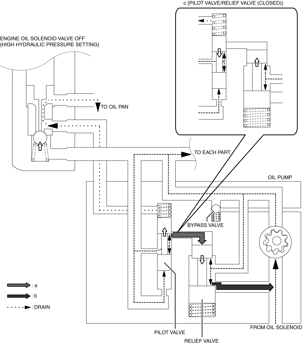 When the hydraulic pressure is less than the pilot valve opening pressure, the pilot valve closes. As a result, the relief valve is closed and engine oil outflow stops (Hydraulic pressure increase).