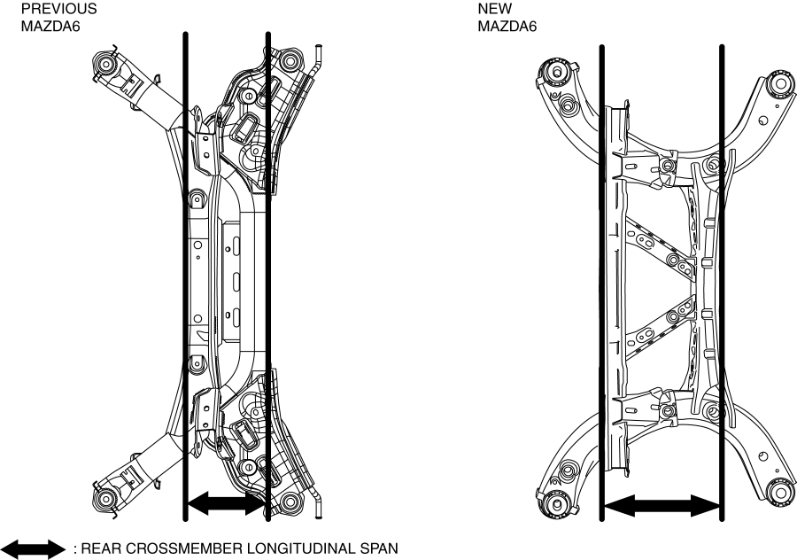 The longitudinal span of the rear crossmember has been expanded and the longitudinal offset of the rear lateral link installation position reduced to realize an optimized framework.