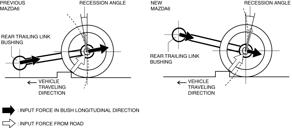 The installation position of the rear trailing link was moved upward so that the longitudinal impact from the road is more easily absorbed in the vertical movement of the rear trailing link. This reduces the longitudinal force input to the rear trailing link bush, improving the ride comfort.