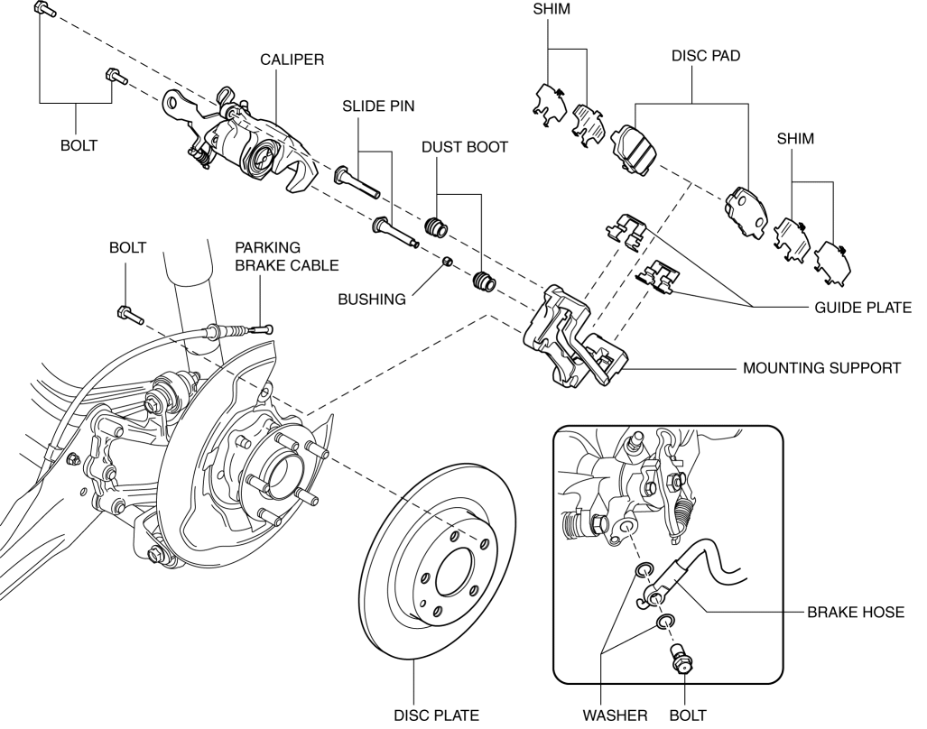 When brake fluid is applied, the piston equipped on one side of the caliper is pushed out and the brake pad is pushed against the disc plate. At the same time, the caliper body moves in the direction opposite of the direction in which the piston is pushed out so as to push the brake pad on the other side and generate brake force.