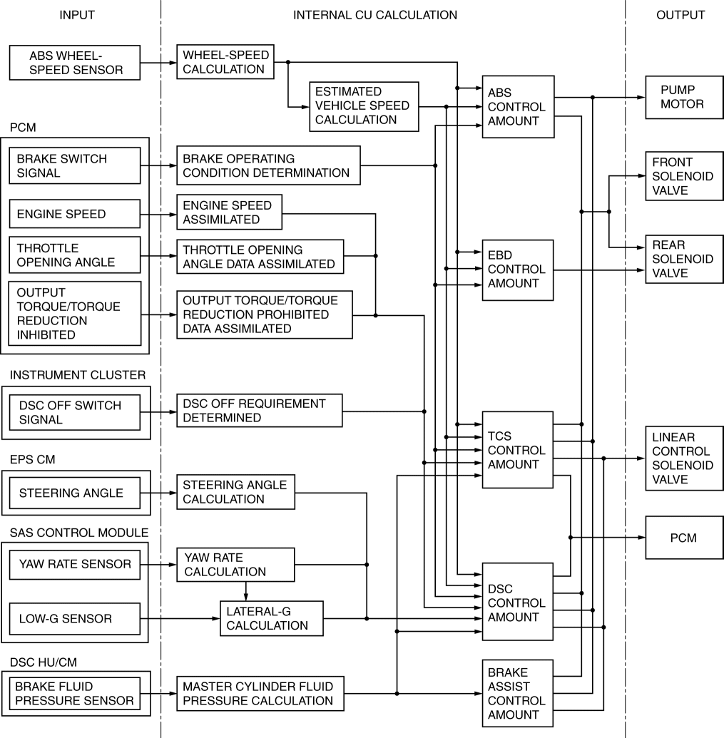 • A function that allows important parts of the DSC control system to perform self-diagnosis. In case a malfunction occurs, the warning lights illuminate to alert the driver, and at the same time a DTC is stored in the DSC HU/CM.