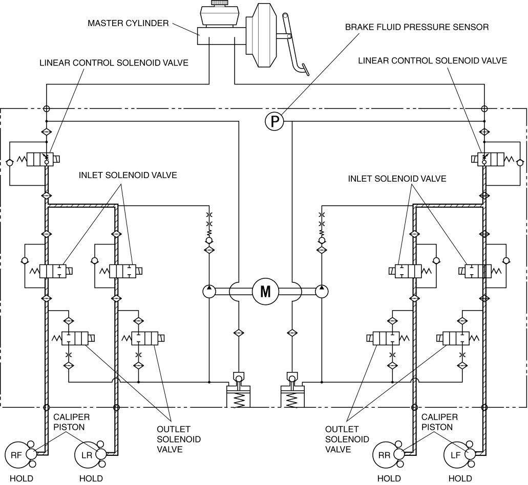 If all of the control conditions are met, the DSC HU/CM controls the linear control solenoid valve and maintains brake fluid pressure (driver can depress brake pedal more at this time).