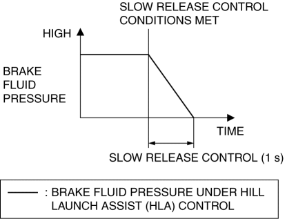 Hill Launch Assist (HLA) is controlled by the DSC HU/CM. When the input signals from each module meet the operation conditions, the DSC HU/CM maintains the brake fluid pressure when the driver depressed the brake pedal (hold control). When the engine torque increases to the point of enabling the vehicle to move forward by depressing the accelerator pedal (ATX vehicles) or depressing the clutch (MTX vehicles), the brake fluid pressure is released (release control) according to the engine torque value.