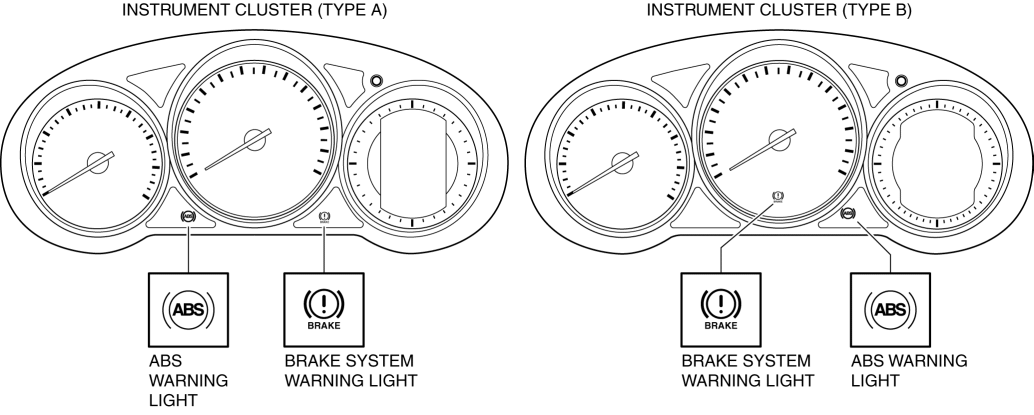 The brake system/ABS warning light is built into the instrument cluster. If a malfunction is detected in the system with the parking brake released, the warning light illuminates to notify the driver.
