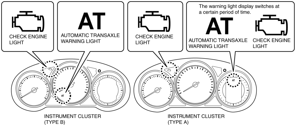 The malfunction indication function notifies the driver of a transaxle malfunction by illuminating the check engine light and automatic transaxle warning light.