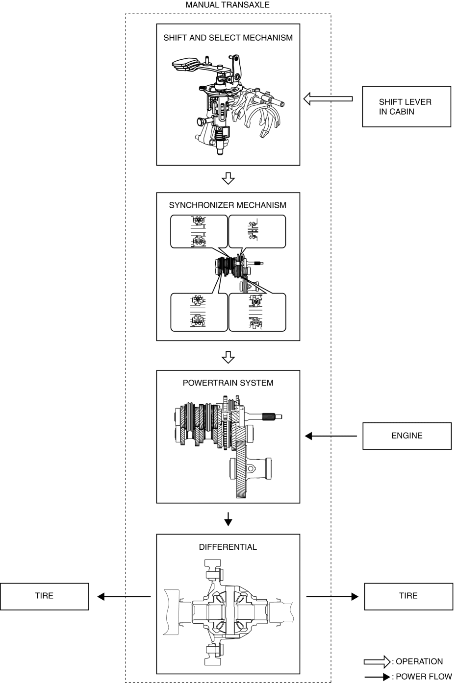 The manual transaxle converts the drive force (speed, torque, rotation direction) input from the engine according to the shift lever operation inside the vehicle.