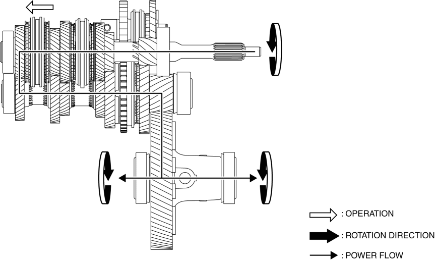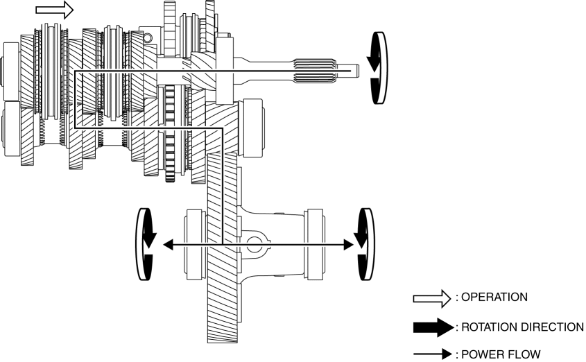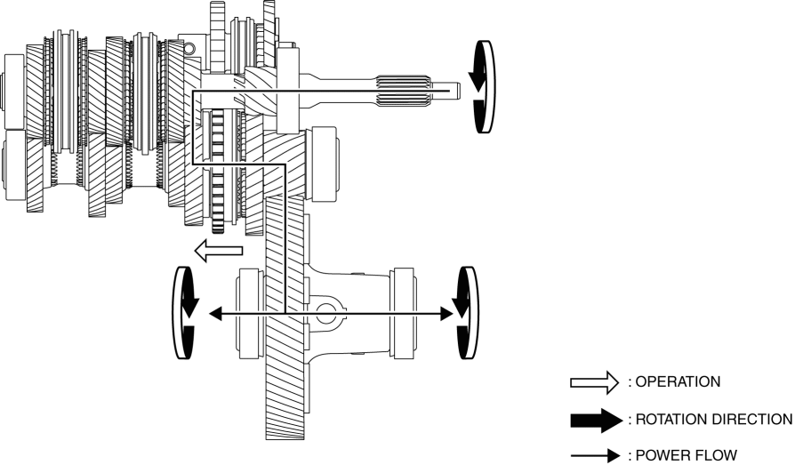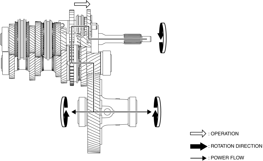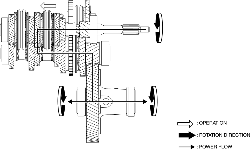 The powertrain mechanism changes the gear combination by engaging or releasing the clutch hub and gear, and changes the power transmission route. Because of the change in the power transmission route, the drive force (speed, torque, rotation direction) input from the engine is converted.