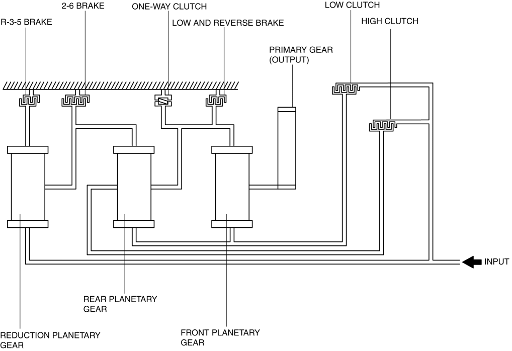 Converts drive force transmitted from engine by operation of each clutch and brake, and transmits it to primary gear. (Operates transaxle.)