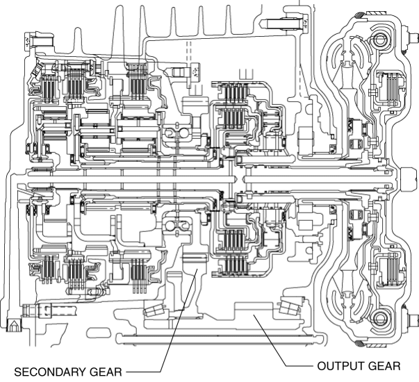 The secondary gear transmits the drive force from the primary gear to the output gear.