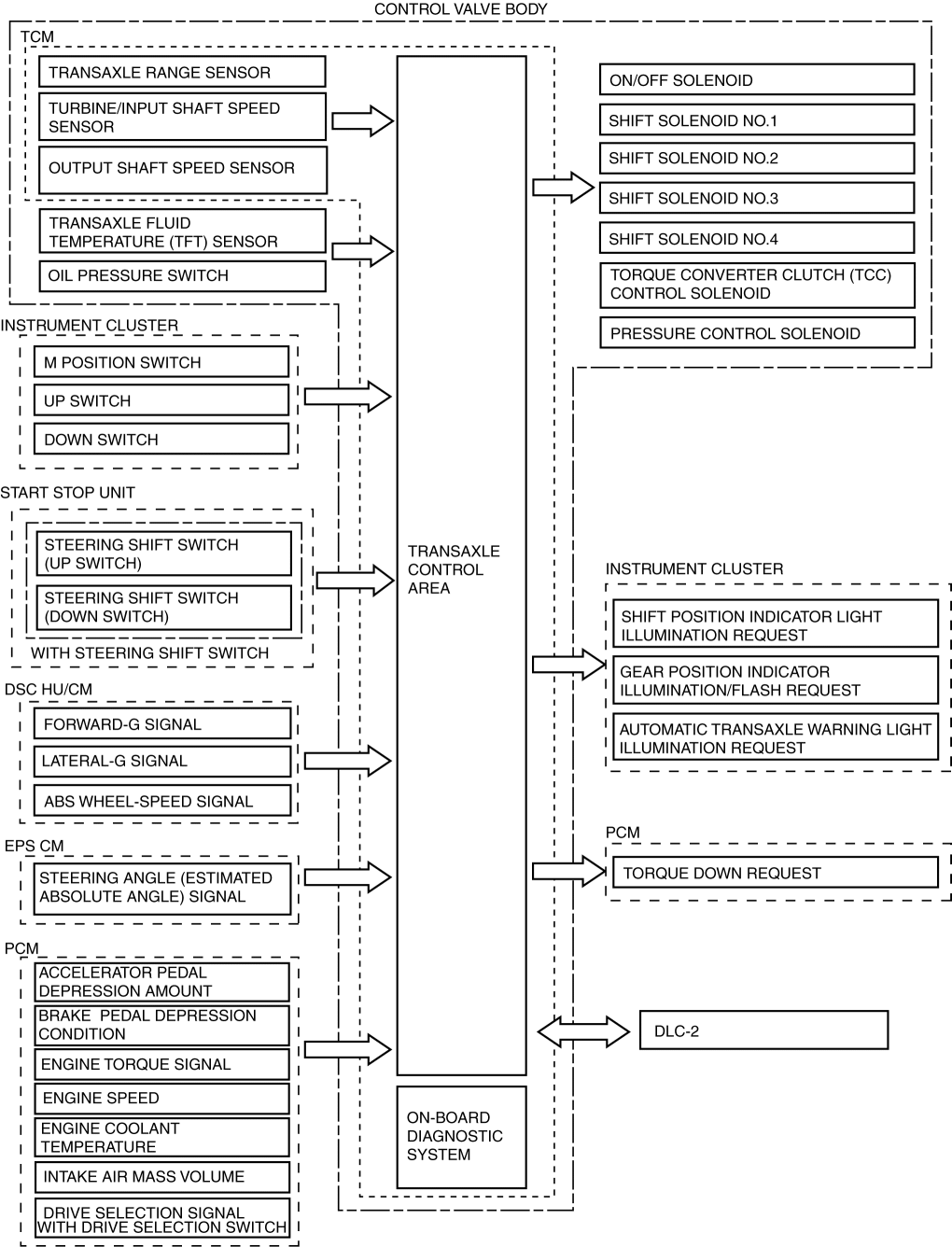 In the electronic control system, the TCM calculates the control content based on signals from each type of sensor and switch to operate output parts such as each solenoid. In consideration of suppressed shift shock, smooth driving, and improved fuel economy, the TCM performs controls so as to maintain the optimum driving performance in response to the vehicles driving scenario.