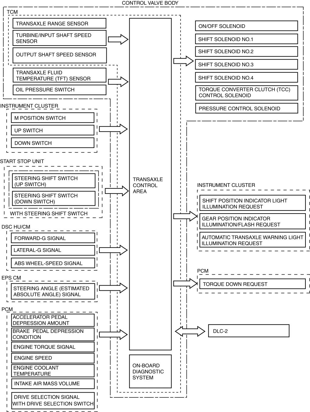 • Main part of transaxle control includes self-diagnosis function. In case of malfunction, automatic transmission warning light illuminates to alert driver, and DTC is stored in TCM