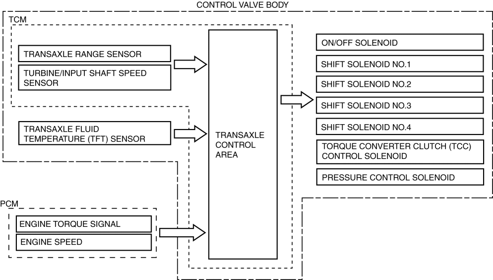 The clutch engagement learning value is not recorded in the TCM installed to the control valve body for the replacement. If the clutch engagement learning value is not recorded in the TCM, engine racing may occur or shift shock may increase. Therefore, when the control valve body is replaced, always perform the initial learning.