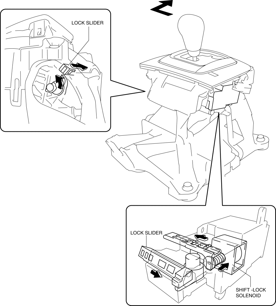 The shift-lock system operates when the ignition is switched ON and the brake pedal is not depressed, and inhibits the selector lever from being shifted from the P position to other positions.