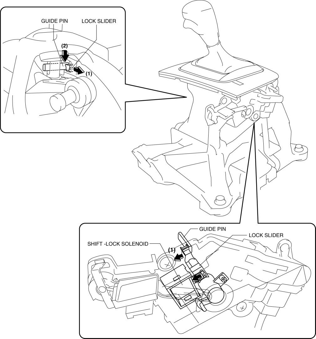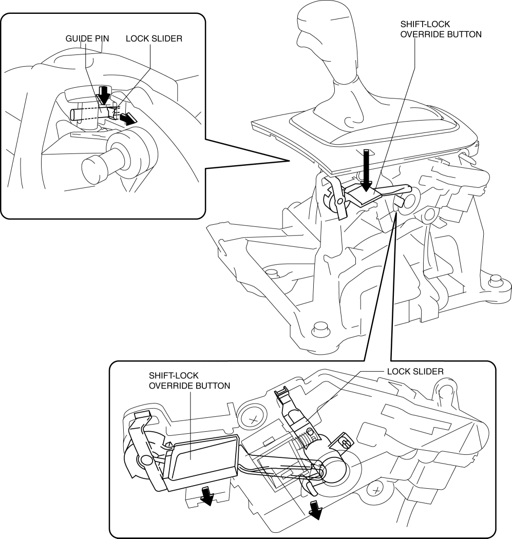 The guide pin restriction can be cancelled forcibly by pressing in the shift-lock override button using a flathead screwdriver, and moving the lock slider.