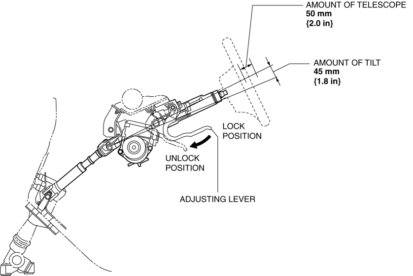 The tilt/telescope mechanism has a movement range of 45 mm {1.8 in} (tilt)/ 50 mm {2.0 in} (telescope) and can be adjusted, without steps, to anywhere in this range.