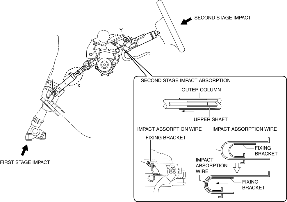 When the body of the driver contacts the steering wheel (second stage impact), the fixing bracket comes off the dashboard member, and the upper shaft and the outer column slide forward. At this time, the impact absorption wire (one part secured to instrument panel member) deforms to absorb the impact to the driver. (Section Y in the figure)