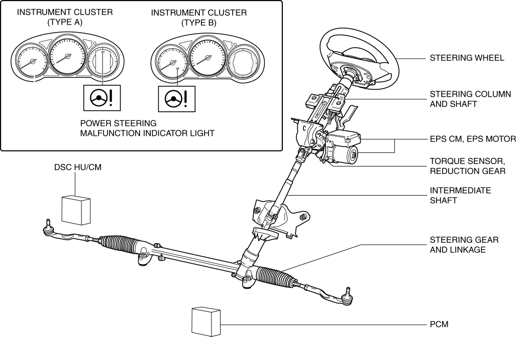 Controls based on the EPS CM, torque sensor, reduction gear, EPS motor, and vehicle speed and engine speed signals input from the PCM.