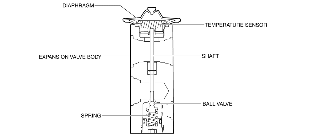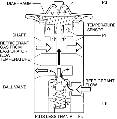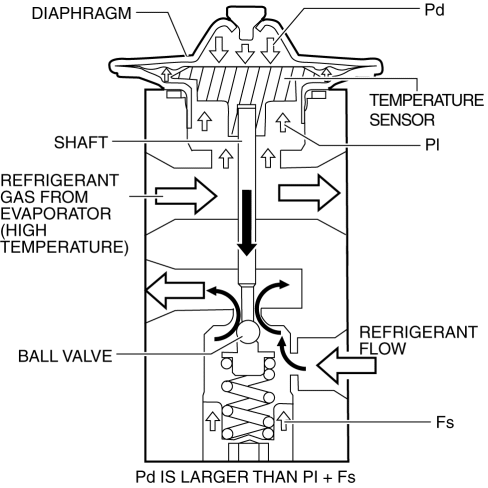 If the refrigerant gas temperature from the evaporator decreases, the expansion valve decreases the amount of refrigerant flow according to the following operation: