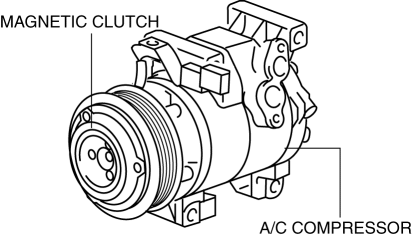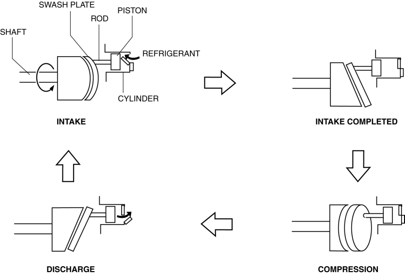 When the drive force from the engine is transmitted to the compressor shaft by the operation of the magnetic clutch, the A/C compressor rotates the swash plate in the compressor. The rotation of the swash plate generates compression in the cylinder by the reciprocating movement of the piston.
