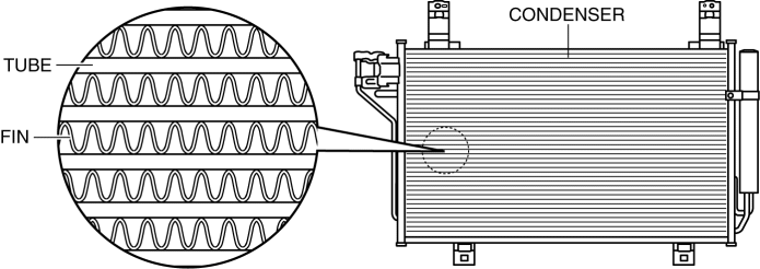 The condenser cools the high-temperature, highly pressurized gaseous refrigerant compressed by the A/C compressor using the outside air, and changes it to liquid refrigerant.