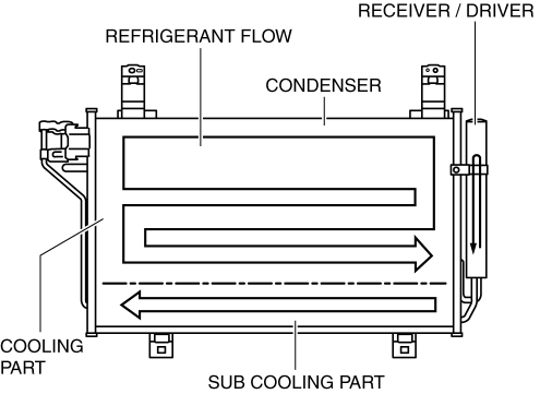 The sub-cooling condenser separates the refrigerant, cooled once by the condenser, into vapor and liquid using the receiver/drier, and by returning it to the sub-cooling part of the condenser again to cool.