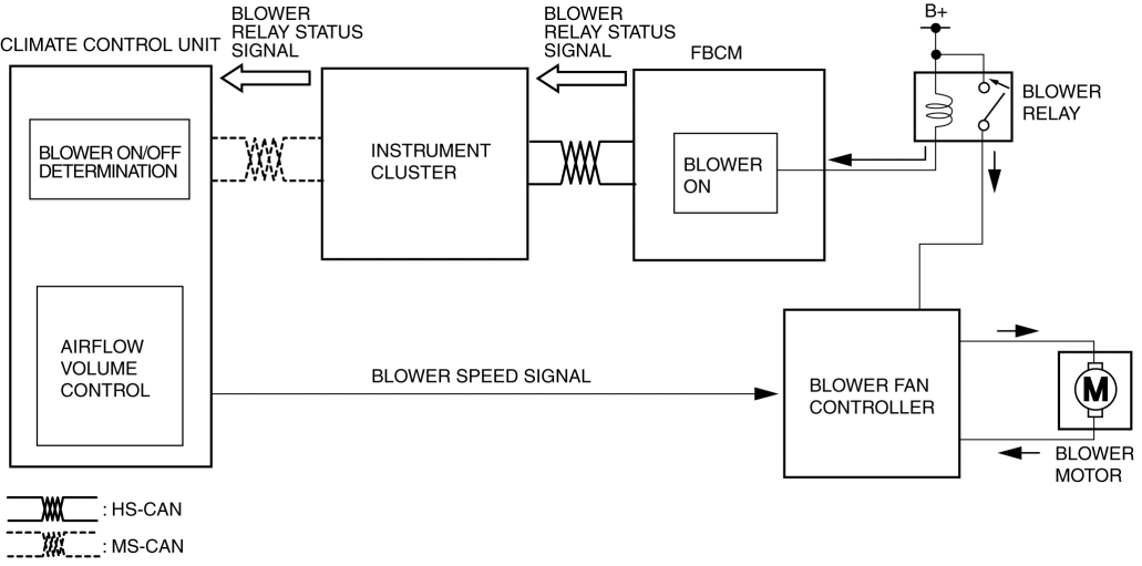 1. When the ignition is switched ON (engine off or on), the front body control module (FBCM) turns the blower relay on.