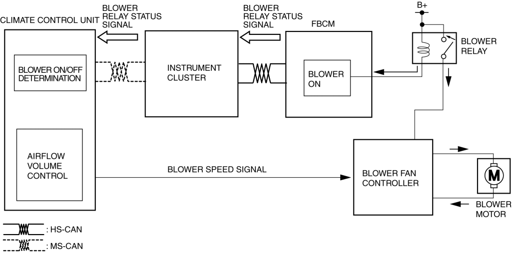 1. When the ignition is switched ON (engine off or on), the front body control module (FBCM) turns the blower relay on.