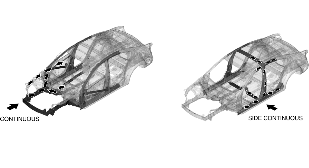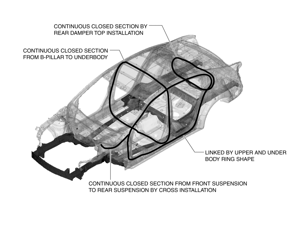 Four ring structures have been created for the upper body including the roof rail and B-pillar, and the entire reinforcement area of the underbody.
