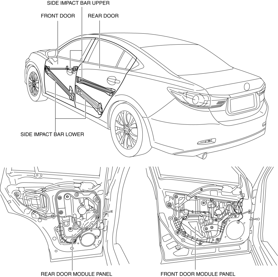 Side impact bars have been adopted on the inside of the front and rear doors. Door modules have been adopted on the front and rear doors.