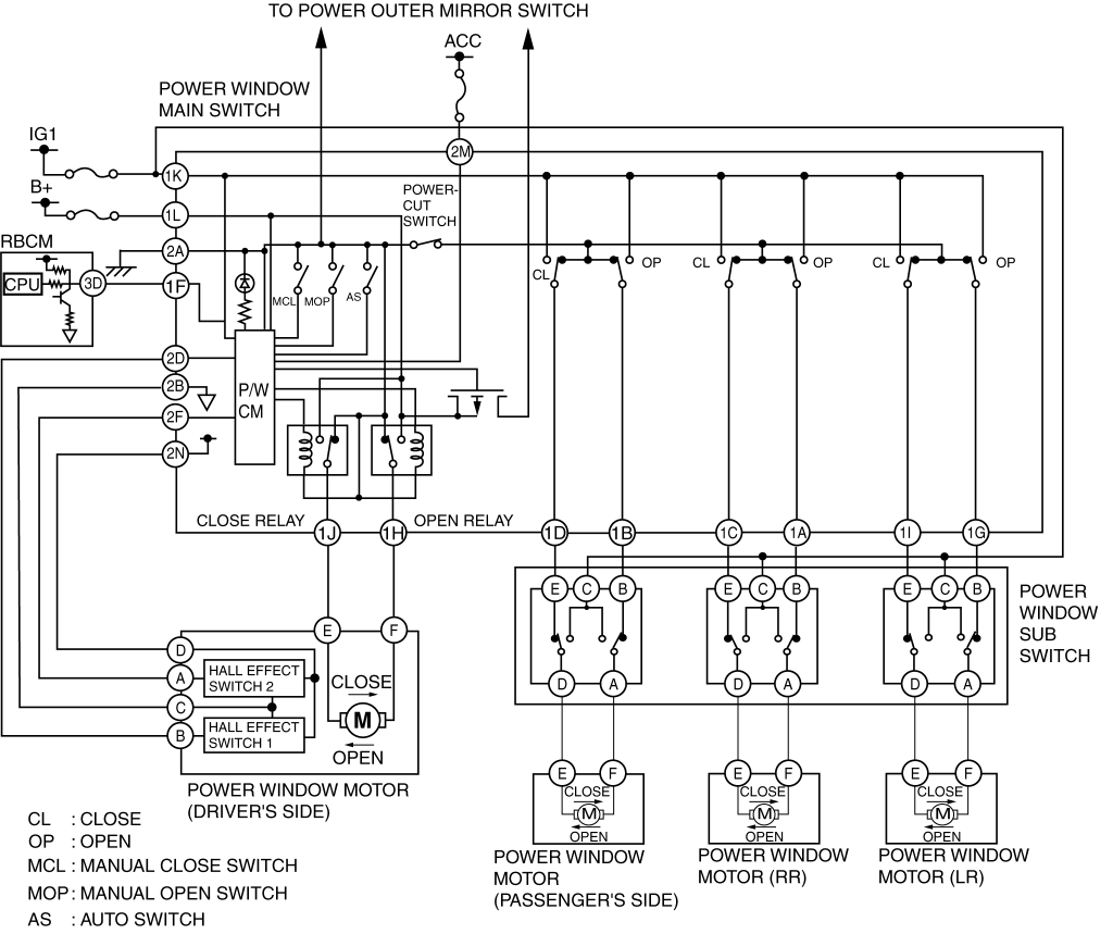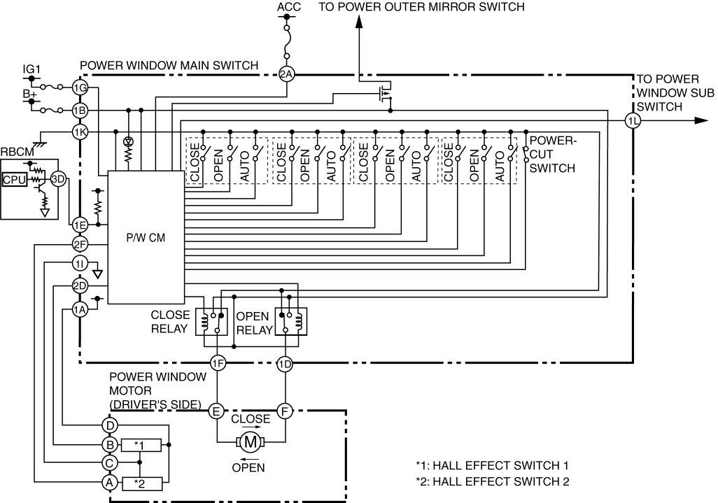1. The P/W CM detects the open/close conditions of all the doors based on the door open/close signal sent from the rear body control module (RBCM).