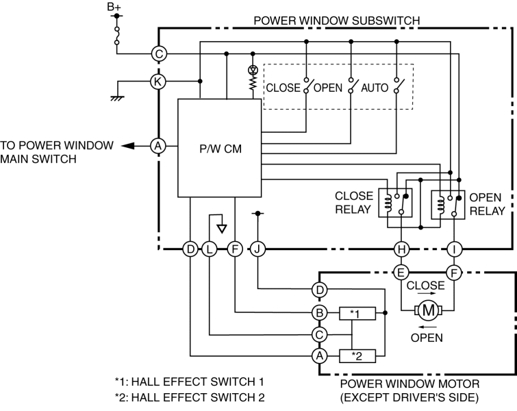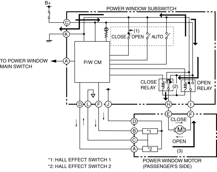 2. When the P/W CM receives an auto close signal, it turns on the close relay. (2)