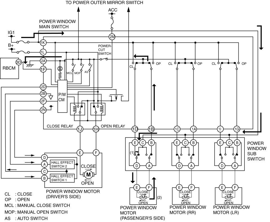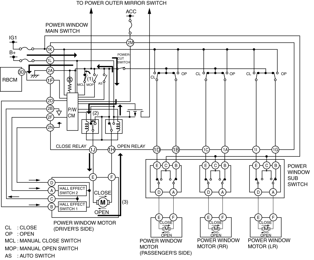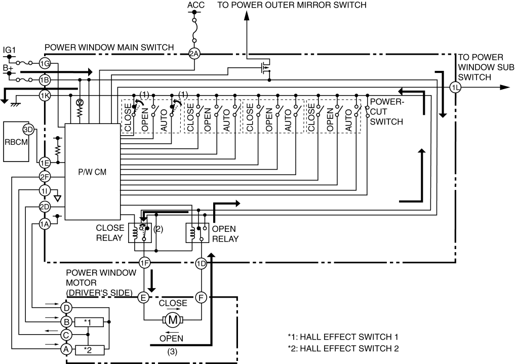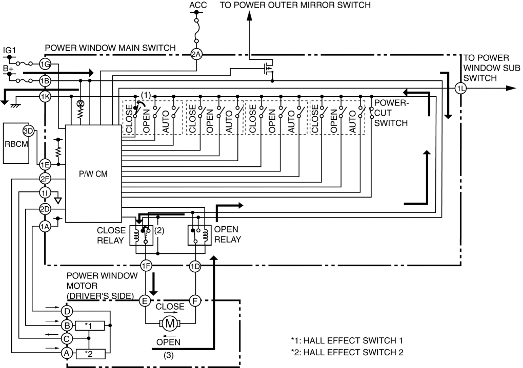 1. When the power window main switch is operated for auto close operation, the P/W CM receives an auto close signal. (1)